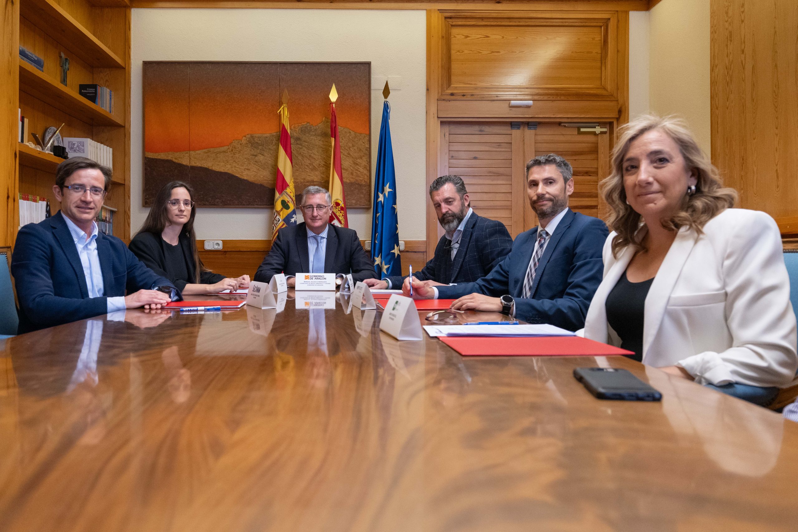 El consejero de Medio Ambiente y Turismo, Manuel Blasco, acompañado del director general de Medio Natural, Alfonso Calvo y del director gerente de SARGA, Jorge Escario, ha firmado hoy el contrato de patrocinio para el Encuentro de Empresas Públicas que tendrá lugar la próxima semana en Torla (Huesca). El contrato se ha suscrito con las empresas Northgate España Renting Flexible, SecAnim Bio-Industries, Transmendoza y Centro Público Integrado de Formación Profesional Movera. Las aportaciones de los patrocinadores corresponden a pagos por especie e intercambio de servicios para el desarrollo del evento.